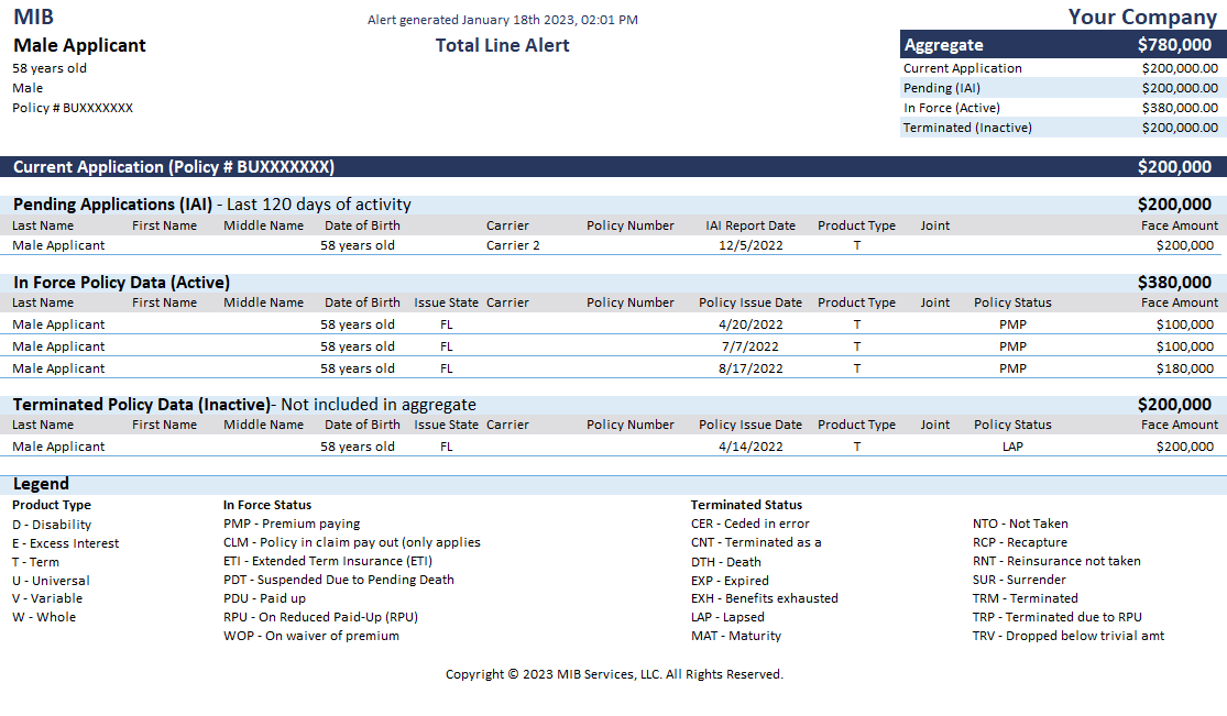 The Total Line Service provides alerts, delivered during the underwriting process, that reflect the total amount of in force and pending life insurance coverage for an applicant. In addition, the alerts include a variety of policy information, including any terminated coverage.