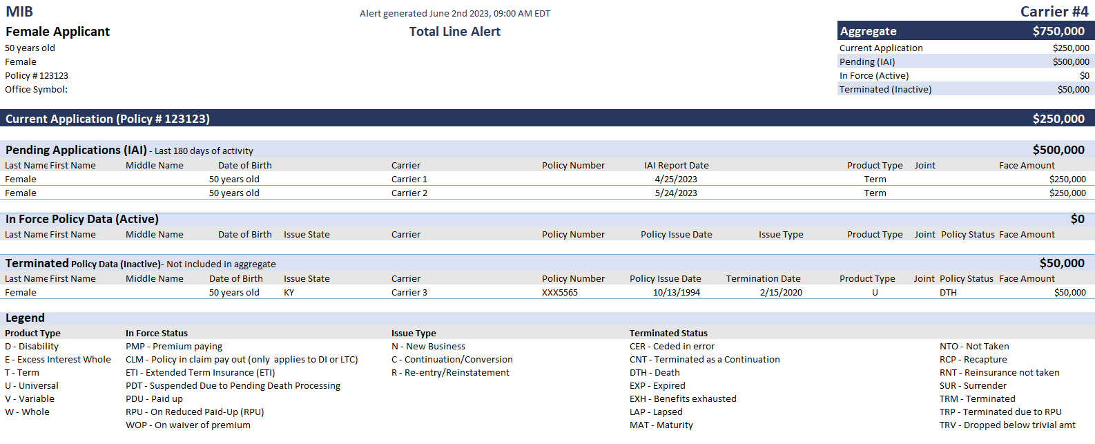 The Total Line Alert shows a 50-year-old female who has applied to three separate companies, in a short duration, for $250K in TERM coverage each. On initial glance, this may appear to be an attempt at stacking coverage, but the terminated policy section reveals deeper concerns. This ‘applicant’ had a policy which resulted in a death claim in 2020!