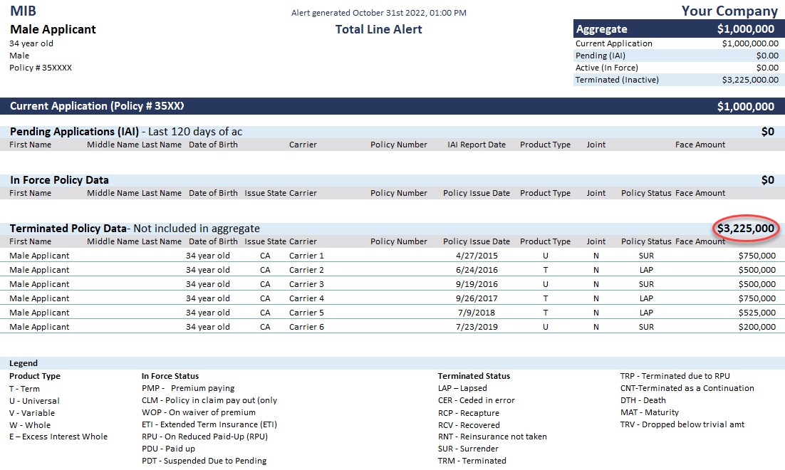 The Total Line Service provides alerts, delivered during the underwriting process, that reflect the total amount of in force and pending life insurance coverage for an applicant. In addition, the alerts include a variety of policy information, including any terminated coverage. With this data, underwriters can not only verify an applicant’s reported coverage level, but also proactively identify patterns and behaviors that may warrant further investigation (such as signs of potential stacking and requirement avoidance).