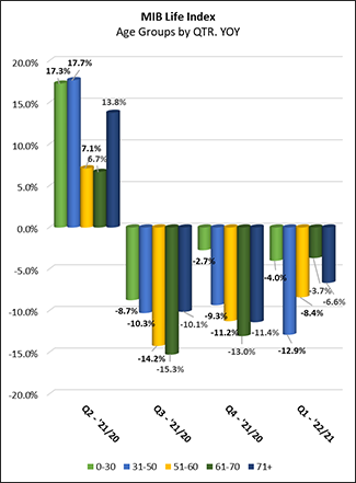 March saw YOY growth for face amounts over $500K up to and including $5M, flat activity for amounts over $5M and double-digit declines for face amounts up to and including $500K. When comparing quarterly activity by face amount, Q1-2022 was at growth compared to Q1-2021 for face amounts over $500K, in the double digits for face amounts over $1M up to and including $5M, but saw double-digit declines for face amounts up to and including $500K. When examining age bands for Q1-2022 compared to Q1-2021, ages 0-30 saw double-digit declines for face amounts up to and including $500K but double-digit growth for face amounts over $500K, in the triple digits (over 120%) for amount over $1M up to and including $2.5M. Age 31-50 saw declines for face amount up to and including $1M, in the double digits for face amounts up to and including $500K, and growth for face amounts over $1M, in the double digits for face amounts over $1M up to and including $5M. Ages 51-60 saw declines for face amounts up to and including $500K, in the double digits for amounts up to and including $250K, flat activity for amounts over $1M up to and including $2.5M, and double-digit growth for amounts over $500K up to and including $1M as well as amounts over $2.5M. Ages 61-70 saw double-digit declines for amounts up to and including $250k, double digit growth for amounts over $250K up to and including $1M, declines for amounts over $1M up to and including $2.5M, double-digit growth for amounts over $2.5M up to and including $5M and double-digit declines for amounts over $5M. Ages 71+ saw declines for face amounts up to and including $1M, in the double digits for amounts over $250K up to and including $1M, and growth for amounts over $1M, in the double digits for amounts over $1M up to and including $2.5M and amounts over $5M.